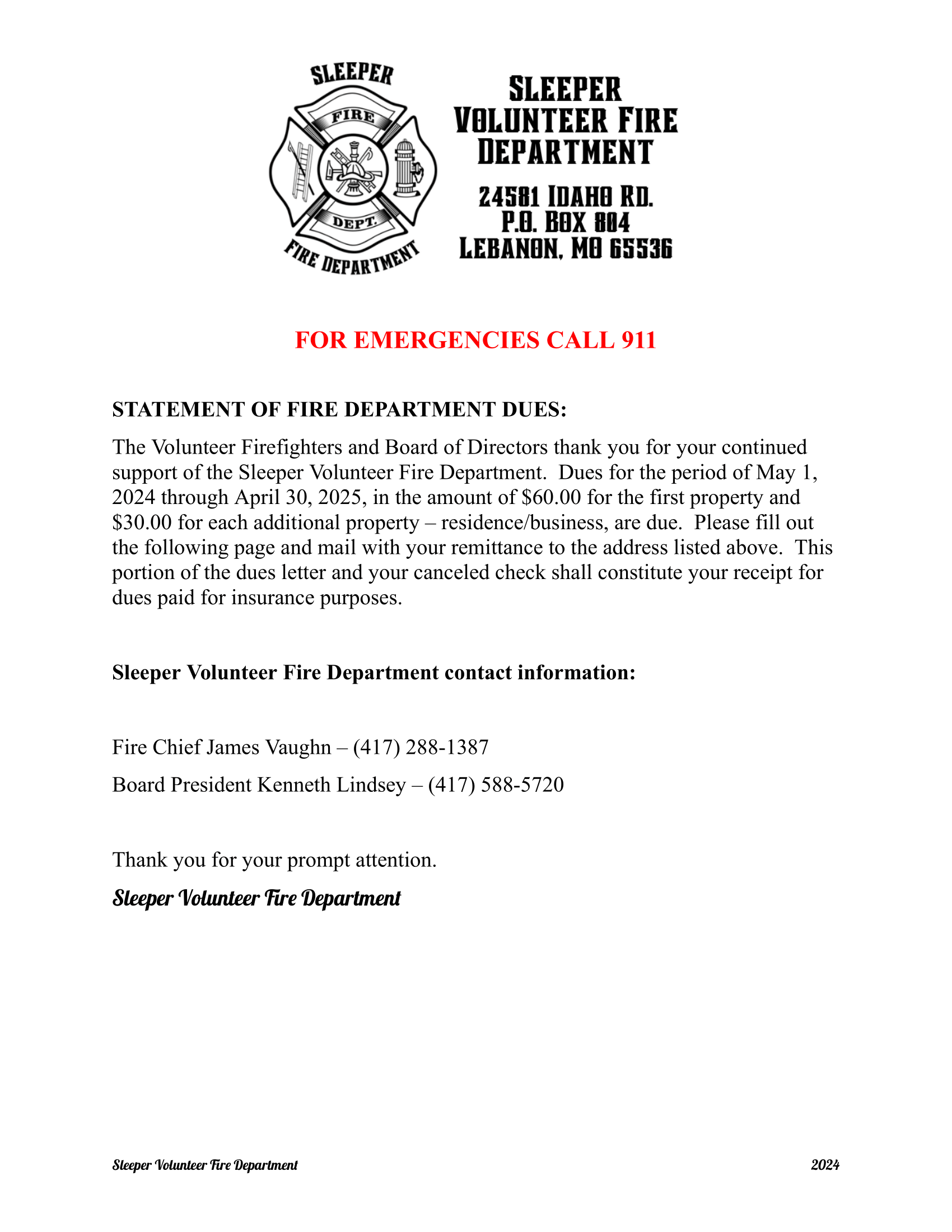 You will soon be receiving your annual dues letter in the mail if you are a resident or landowner in either the Sleeper or the Stoutland Volunteer Fire Departments’ District.