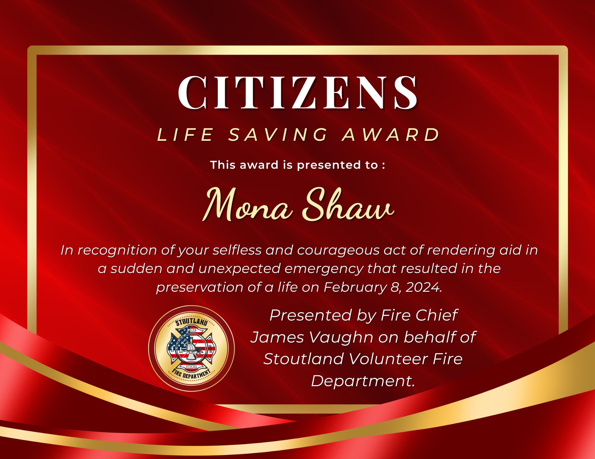 After the parade, Stoutland Fire Chief James Vaughn presented four exceptional teachers who went above and beyond the call of duty and assisted with life-saving efforts by providing CPR until first responders arrived on scene.