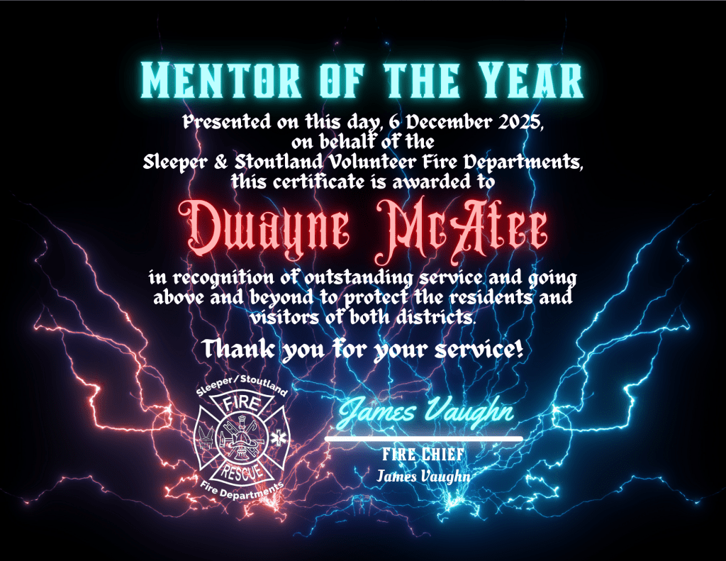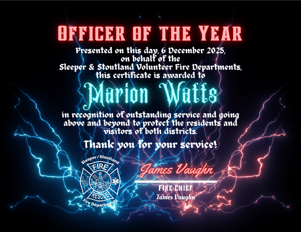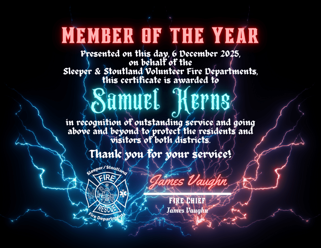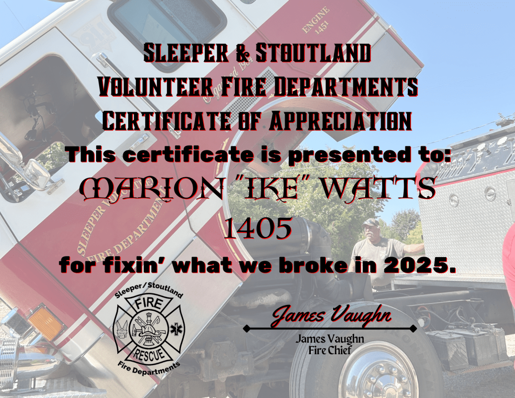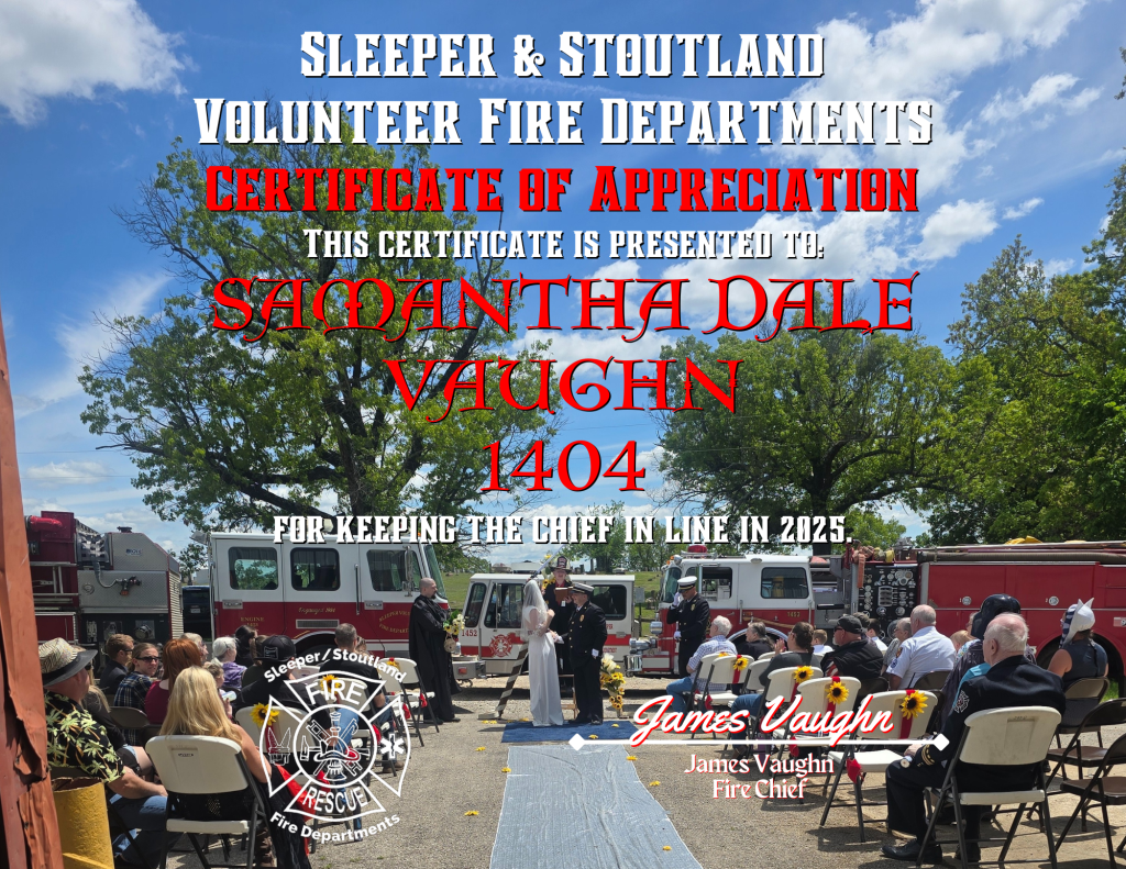 I serve as the Public Information Officer (PIO) for Sleeper & Stoutland Volunteer Fire Departments. I was recently appointed to the Stoutland Volunteer Fire Department Board of Directors.