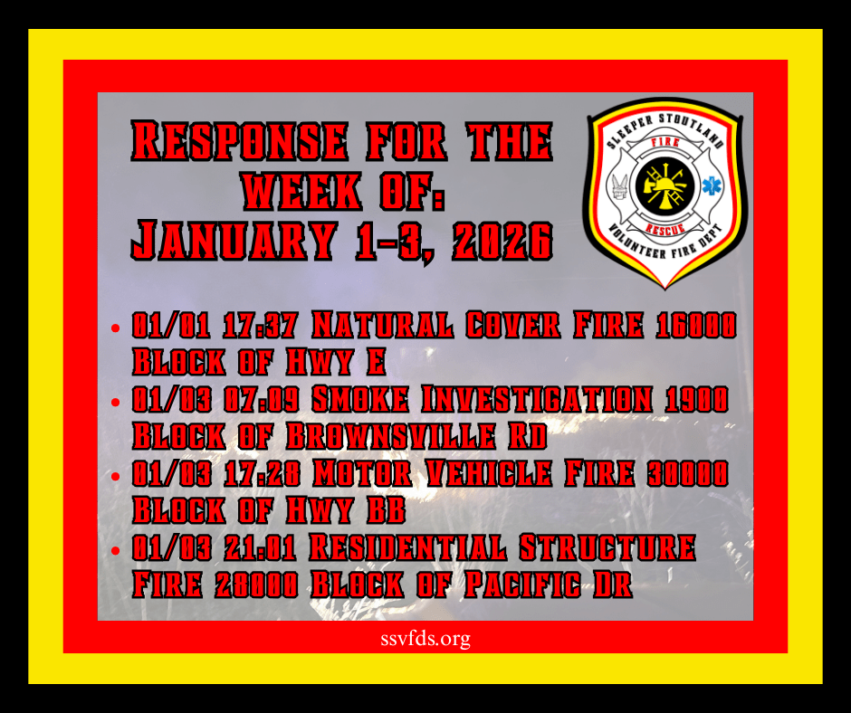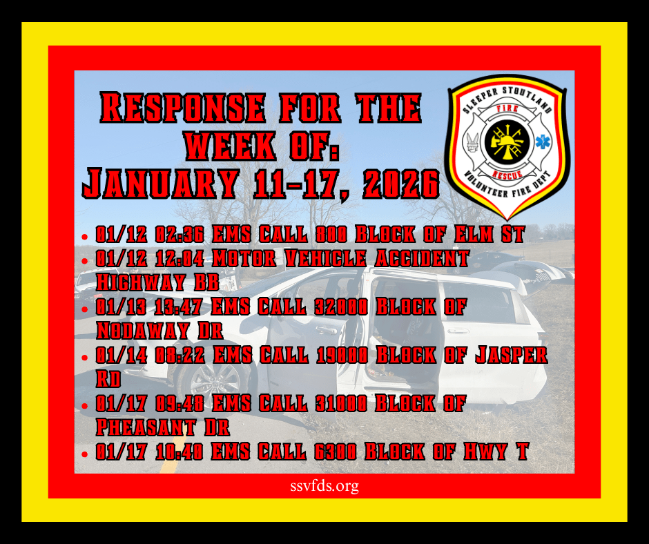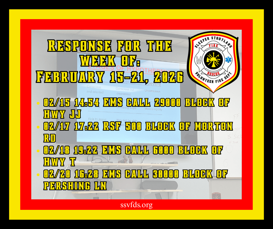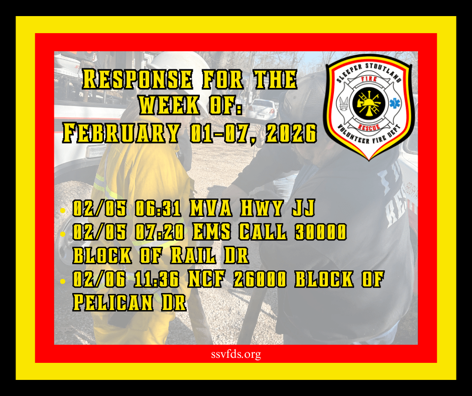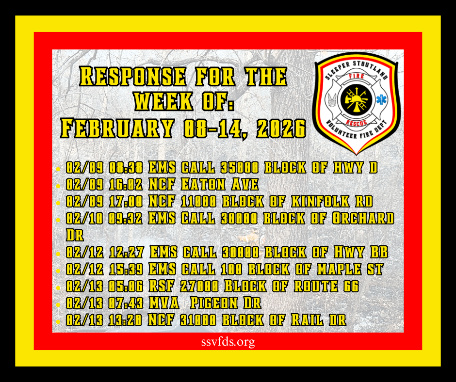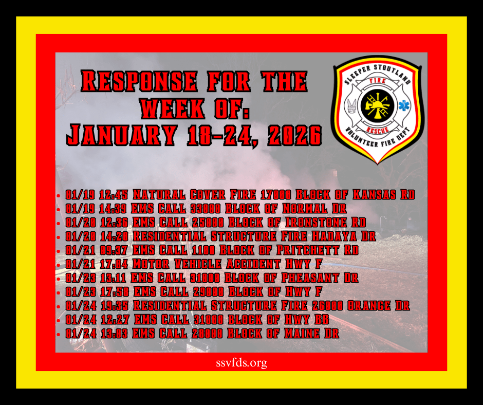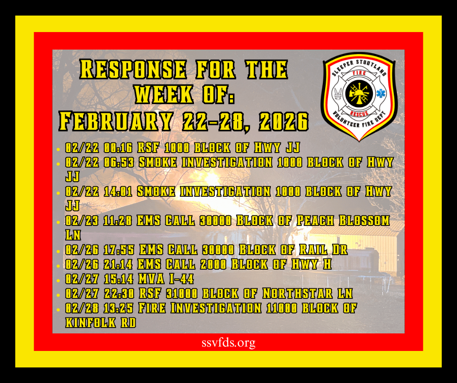 Established in 1973, the Stoutland Volunteer Fire Department covers 110 square miles and includes Stoutland School, Camden County Library Stoutland Branch, Post office, Gas station, and Ozarks Fishery, Circle F Cattle Company, railroad, three pipelines, senior center, numerous churches, homes, and apartments.