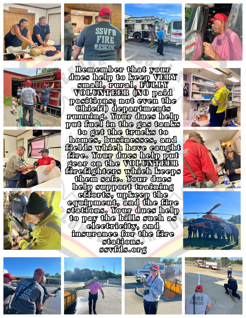 Dues are $60/year for the first residence on the first property and $30/year for each additional residence on the first property (if you own more than one property, please pay for each additional property as well. For any questions, please contact Fire Chief James Vaughn at 417-288-1387) and can be paid via check or money order to the following: